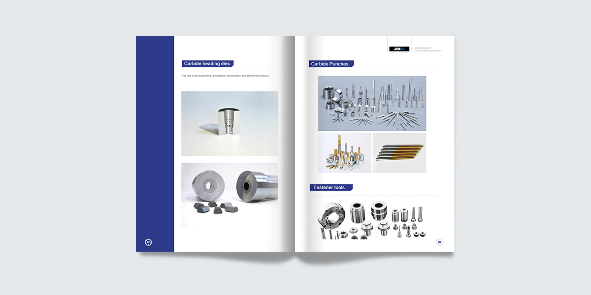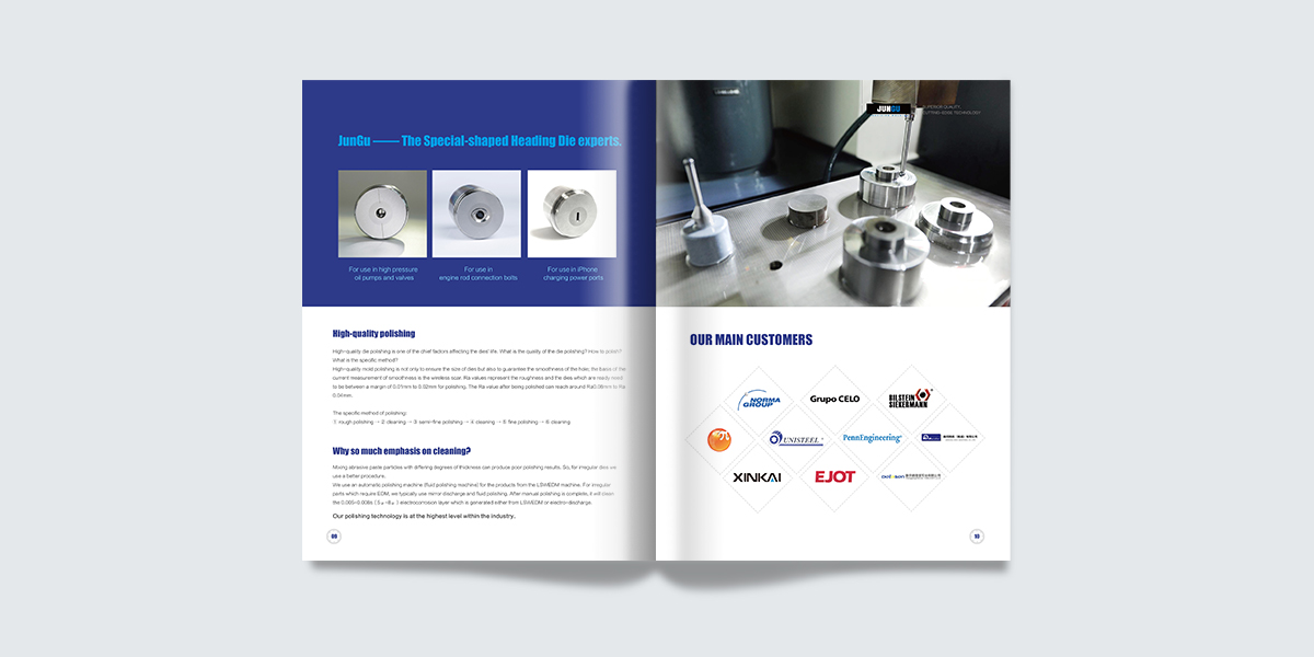 鈞固精密模具是專業(yè)從事冷鐓模具的研發(fā)生產(chǎn)企業(yè),一直配套與汽車、航空等高端緊固件及異型零部件的企業(yè),公司擁有一批多年冷鐓操作、設(shè)計(jì)、及模具制造的技術(shù)團(tuán)隊(duì)并與國內(nèi)外多家知名大型汽車緊固件廠保持長期合作。公司主要產(chǎn)品有:多工位螺栓螺母模具、硬質(zhì)合金異型模、以及冷鐓設(shè)備周邊各種配件。蘇州畫冊設(shè)計(jì)/吳江畫冊設(shè)計(jì)/昆山畫冊設(shè)計(jì)-蘇州覺世品牌策劃有限公司